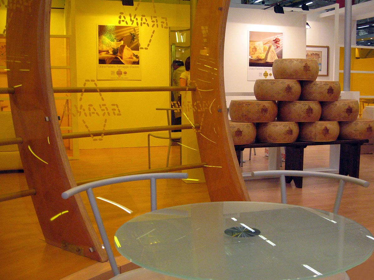 A prestigious exhibition stand for one of the leading Italian companies in food industry food world-wide. Honegger realised the Grana Padano exhibition stand at CIBUS - International Food Exhibition. Cibus, International Food Exhibition, is the key event of the Italian agri-food sector, that place every year in the exhibition centre of Parma, a place included in 2014 in the Città del Gusto circuit. The event brings together only food professionals, and every year registers thousands of international buyers and visitors. An important showcase that, in addition to giving great international visibility to companies and their products, organises conferences and roundtables on topics of relevance for Food and Retail.Repository of a historical, cultural and food heritage, the Consorzio Grana Padano brings together 130 producers, distributed in Lombardy, Veneto, Emilia Romagna and Piedmont. The Consorzio follows the traditional Grana Padano recipe and land safeguards and ethical standards, underlying the ‘Grana Padano’ protected designation of origin (PDO). The exhibition design concept of the Honegger exhibition stand re-elaborates shapes and colours characteristic of the product and the brand, to return a split image in the architectural elements of the booth. In the exhibition space there are two environments designed to accommodate buyers, and a large desk on which the brand image is reproduced.